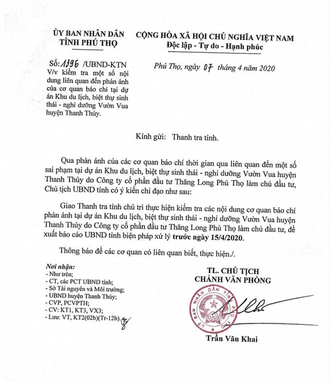 Cụ thể, tại văn bản số 1396 ngày 7/4/2020 do ông Trần Văn Khai, Chánh văn phòng UBND tỉnh Phú Thọ thừa lệnh Chủ tịch UBND tỉnh Phú Thọ ký nêu rõ: Qua phản ánh của các cơ quan báo chí thời gian qua liên quan đến một số sai phạm tại dự án Khu du lịch, biệt thự sinh thái - nghỉ dưỡng Vườn Vua do Công ty Cổ phần đầu tư Thăng Long Phú Thọ làm chủ đầu tư, Chủ tịch UBND tỉnh Phú Thọ có ý kiến chỉ đạo như sau: Giao Thanh tra tỉnh chủ trì thực hiện kiểm tra các nội dung cơ quan báo chí phản ánh, đề xuất báo cáo UBND tỉnh biện pháp xử lý trước ngày 15/4/2020.