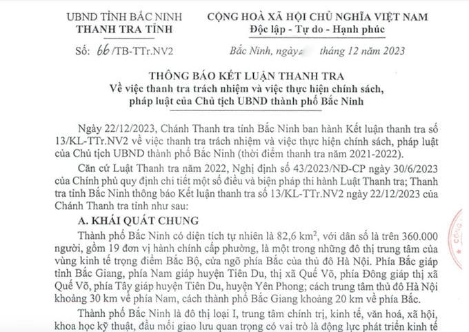 Thanh tra tỉnh Bắc Ninh đã ban hành kết luận về thanh tra trách nhiệm và việc thực hiện chính sách, pháp luật của Chủ tịch UBND TP. Bắc Ninh (thời điểm thanh tra năm 2021-2022).