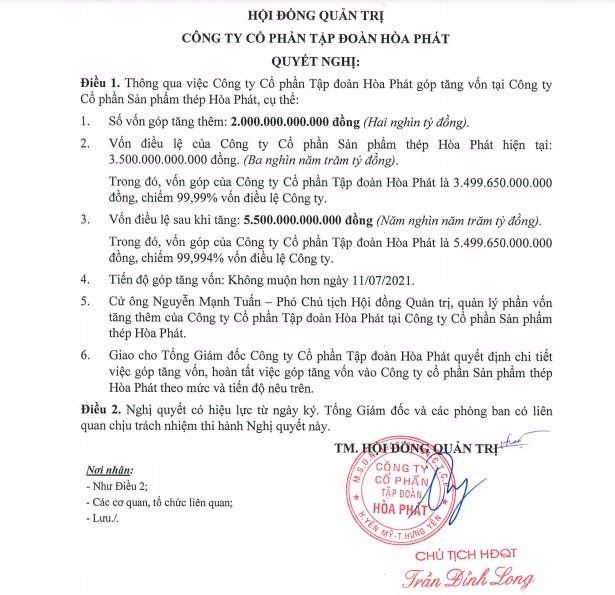 Chủ tịch HĐQT Tập đoàn Hòa Phát (Mã: HPG) Trần Đình Long vừa ký nghị quyết thông qua việc tăng vốn tại Công ty cổ phần Sản phẩm thép Hòa Phát thêm 2.000 tỷ đồng (từ 3.500 tỷ đồng lên 5.500 tỷ).