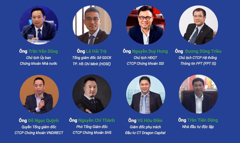 Các diễn giả tham dự buổi tọa đàm gồm có: Ông Trần Văn Dũng, Chủ tịch Ủy ban Chứng khoán Nhà nước; ông Lê Hải Trà, Tổng Giám đốc Sở GDCK Tp.HCM (HOSE); ông Nguyễn Duy Hưng, Chủ tịch HĐQT Công ty Chứng khoán SSI; ông Dương Dũng Triều, Chủ tịch HĐQT Công ty CP Hệ thống thông tin FPT (FPT IS); ông Đỗ Ngọc Quỳnh, Quyền tổng Giám đốc Công ty Chứng khoán VNDIRECT; ông Nguyễn Chí Thành, Phó Tổng Giám đốc Công ty Chứng khoán SHS; ông Vũ Hữu Điền, Giám đốc phụ trách danh mục đầu tư DragonCapital; ông Trần Tiến Dũng, nhà đầu tư độc lập.