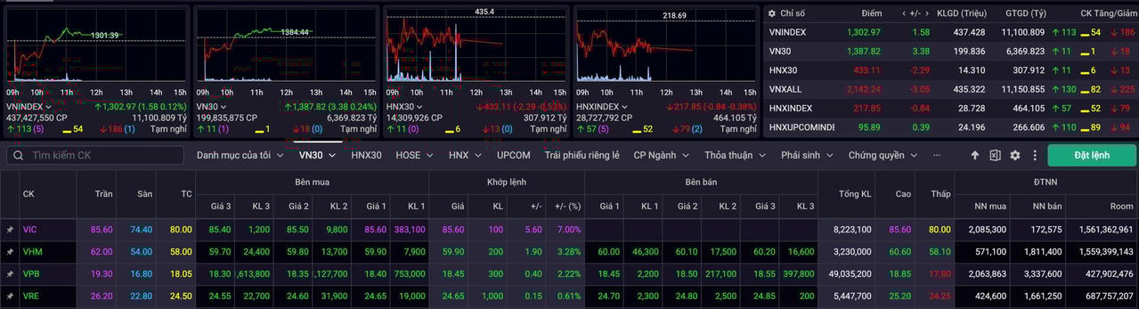Ngay đầu phiên, thị trường mở cửa trong sắc đỏ, chỉ số VN-Index lùi về mốc 1.292 điểm. Tuy nhiên, nhờ lực đẩy mạnh mẽ từ nhóm cổ phiếu trụ cột, đặc biệt là VIC, VHM và VPB, chỉ số nhanh chóng đảo chiều tăng điểm và đóng cửa phiên sáng tại 1.303 điểm.