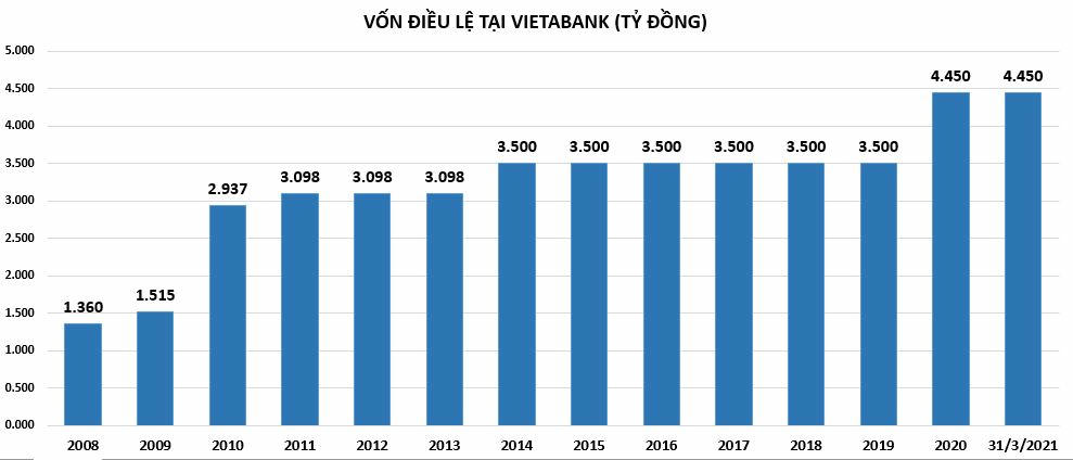 Từ khi hoạt động đến nay, VietABank đã có 18 lần tăng vốn điều lệ, từ mức 75,7 tỷ đồng lên gần 4.450 tỷ đồng. Ngân hàng này đang lên kế hoạch tăng vốn điều lệ thêm 950 tỷ đồng thông qua phát hành cổ phiếu để trả cổ tức với tỷ lệ 21,35%.