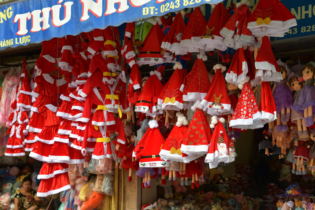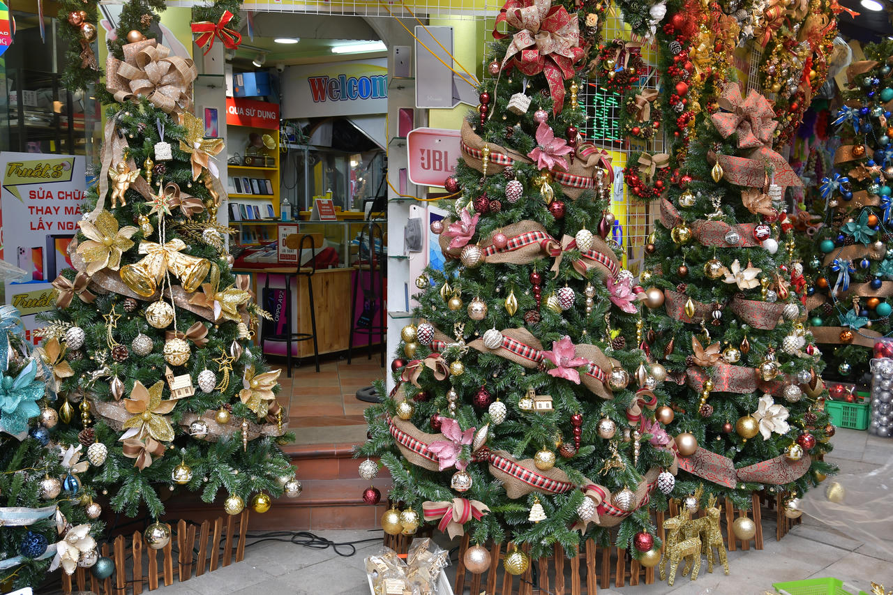 Tuy nhiên, không khí mua bán không được tấp nập như mọi năm.Năm nay, những đồ trang trí Noel đặc trưng như: chuông trang trí, đèn, cây thông, vòng nguyệt quế, người tuyết, lính chì,... vẫn là mặt hàng chủ đạoMột tiểu thương chia sẻ, năm nay khách lui tới để mua sắm, chụp ảnh ít hơn những năm trước, giờ mọi người chuộng mua hàng online hơn. Anh đang hoàn tất các khâu trang trí cây thông để bán.Những cây thông Noel được trang trí và thiết kế với hiều kiểu dáng đa dạng.Chủ cửa hàng cho biết, cây thông Noel lớn, đầy đủ trang trí có giá khoảng 3 triệu đồng, cây nhỏ hơn bán từ vài trăm nghìn đến một triệu đồng.Những chùm chuông với nhiều màu sắc và kích cỡ khác nhau cũng được bày bán dọc phố Hàng Mã để thu hút khách hàng. Những chiếc chuông này có giá vài chục đến vài trăm nghìn.Những chiếc bờm với chủ đề Noel dành cho cả người lớn và trẻ nhỏ có giá 20 nghìn/chiếc.Bộ trang phục ông già Noel, với đầy đủ kích cỡ và chất liệu cho cả trẻ em và người lớn. Giá mỗi bộ dao động từ 100 - 200 nghìn đồng.