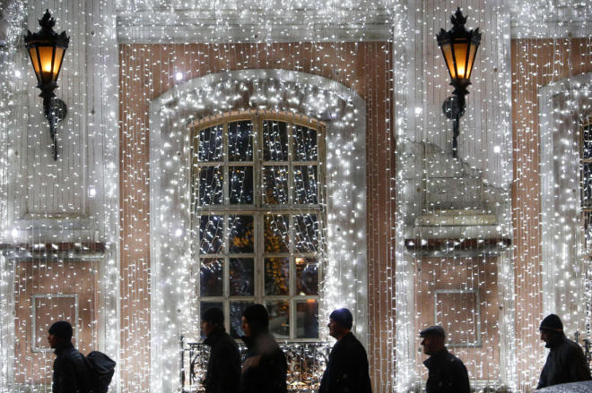 Người dân đi qua một tòa nhà được trang hoàng ở trung tâm Moscow, Nga.