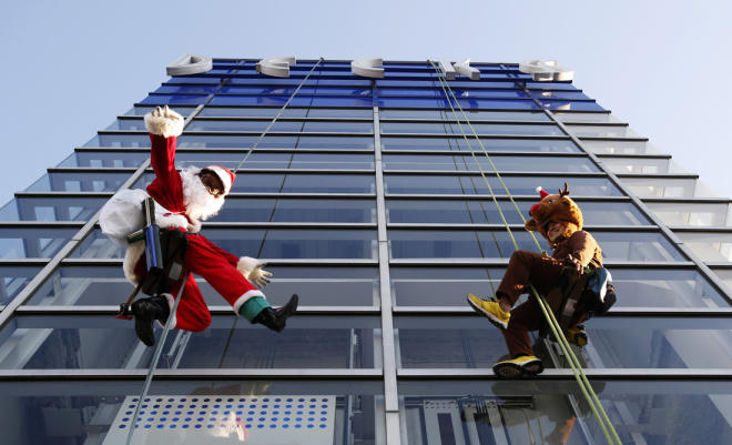 Các nhân viên lau dọn ăn vận đồ của ông già Noel và tuần lộc chào đón Giáng sinh tại một trung tâm mua sắm ở Tokyo, Nhật Bản.