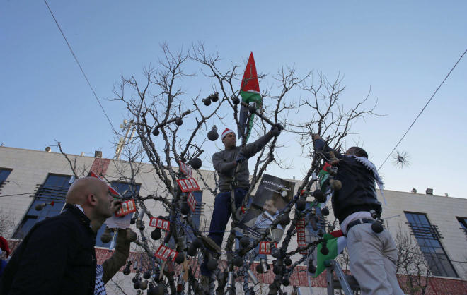 Người dân Palestine trang trí cây tại Quảng trường Manger Square.