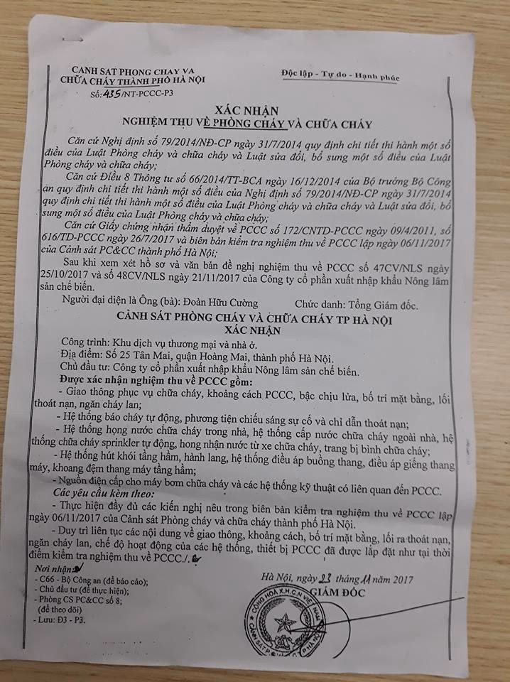 Người dân cũng cho biết, cư dân đã nhận bàn giao và về ở chính thực tại tòa nhà đã được khoảng 4 năm, tuy nhiên, đến ngày 23/11/2017, tòa nhà chung cư 25 Tân Mai mới chính thức được nghiệm thu PCCC.