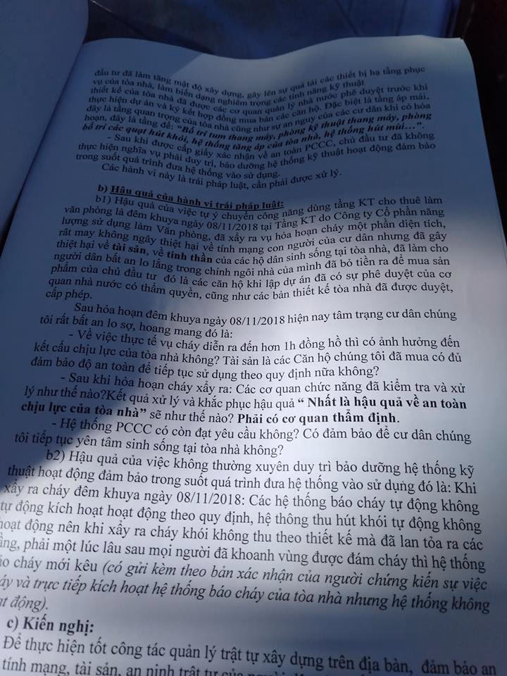 Đặc biệt, vấn đề khiến cư dân lo lắng nhất hiện nay là vụ cháy diễn ra hơn 1h đồng hồ liệu có ảnh hưởng đến kết cấu chịu lực của tòa nhà không? Hệ thống PCCC trong tòa nhà hiện nay có còn đạt yêu cầu không?