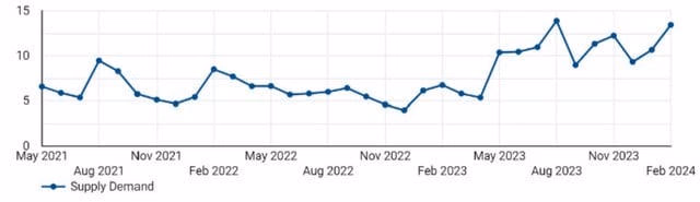 Minh chứng cho điều này, dữ liệu Batdongsan.com.vn đã chỉ ra, nhu cầu tìm kiếm đối với chung cư tại Hà Nội đang ngày càng cao. Theo đó, nhu con số này tăng rất mạnh từ cuối 2023, đạt đỉnh vào tháng 8/2023. Sau đó lượng người bán ra chung cư rất lớn khiến lượng cầu giảm mạnh.