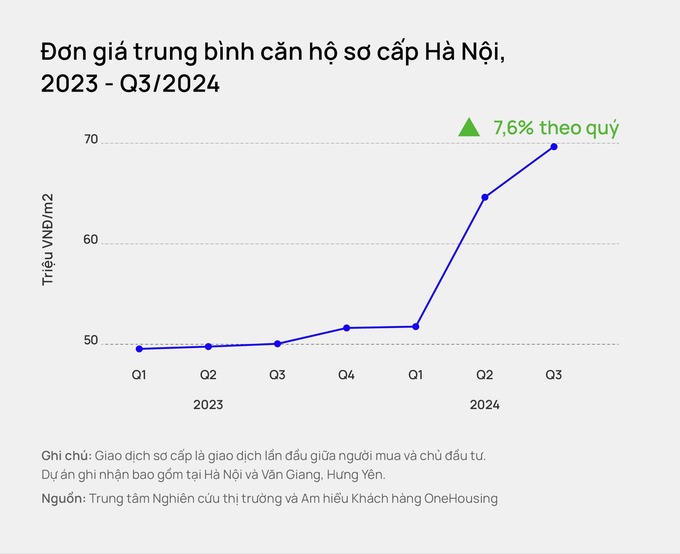 Theo dữ liệu từ Trung tâm Nghiên cứu thị trường và Am hiểu khách hàng OneHousing, trong quý III/2024, giá trung bình căn hộ mới mở bán tại Hà Nội đã tăng lên gần 70 triệu đồng/m2, tăng 7,6% so với quý trước. Sự tăng trưởng này phản ánh sức nóng của thị trường chung cư Hà Nội, đồng thời cho thấy giá căn hộ tại thủ đô có khả năng tiệm cận mức giá của TP. HCM trong thời gian tới.
