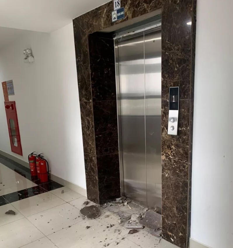 Đá ốp lát ở cửa thang máy bị rơi ụp xuống khiến nhiều người lo lắng, bức xúc
