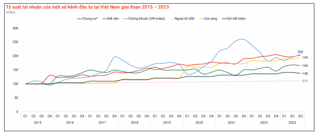 Trong khi đó, chứng khoán là nhóm đầu tư có biên độ biến động tăng giảm lớn thì đầu tư bất động sản căn hộ có biên độ giao động nhỏ hơn và có khuynh hướng tăng trưởng trong dài hạn, tiền gửi ngân hàng vẫn là lựa chọn đầu tư luôn dương nhưng biên độ lợi nhuận khá nhỏ.