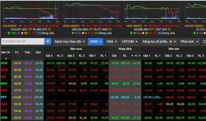 Sắc đỏ chiếm áp đảo trên bảng giao dịch điện tử khi có tới 319 mã giảm giá, chỉ 153 mã tăng giá. Đáng chú ý, tại nhóm VN30, số mã giảm giá nhiều gấp gần 3 lần tăng giá (22 mã và 8 mã).