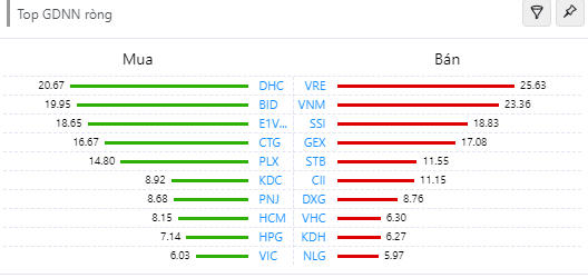 Khối ngoại vẫn duy trì trạng thái bán ròng nhưng giá trị giảm đáng kể so với phiên trước và ở mức 63 tỷ đồng (gồm cổ phiếu và chứng chỉ quỹ). VRE đứng đầu danh sách bán ròng của khối ngoại với 25,6 tỷ đồng. Ngoài ra, các cổ phiếu bất động sản như CII, DXG, KDH và NLG cũng nằm trong danh sách bị khối ngoại bán ròng mạnh. Chiều ngược lại, chỉ có VIC là cổ phiếu bất động sản nằm trong top 10 mã được mua ròng mạnh nhất nhưng giá trị cũng chỉ là hơn 6 tỷ đồng.