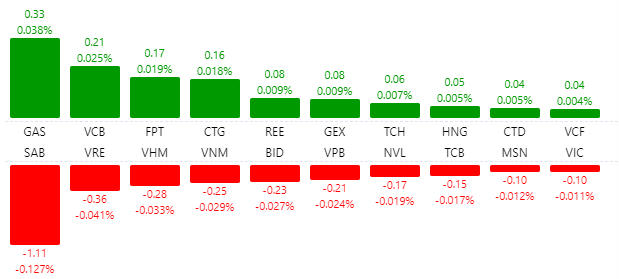 Chiều ngược lại, GAS, VCB, FPT, CTG, REE… là các cổ phiếu làm trụ đỡ tốt cho thị trường giúp VN-Index không giảm quá sâu. GAS tăng 0,8% lên 74.900 đồng/cp, VCB tăng 0,2% lên 82.900 đồng/cp, FPT tăng 1,8% lên 48.650 đồng/cp.