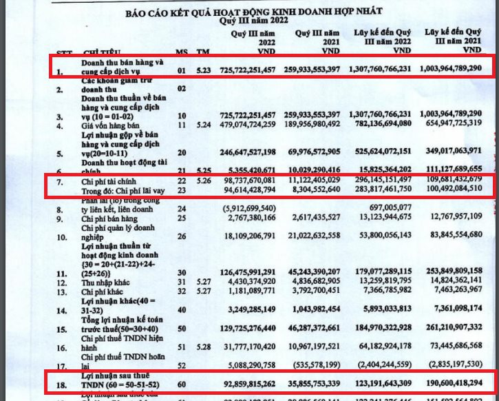 Trong kỳ, doanh thu tài chính giảm 50% còn hơn 5 tỷ đồng trong khi chi phí tài chính tăng vọt 9 lần lên 99 tỷ đồng với 95 tỷ đồng là lãi vay.