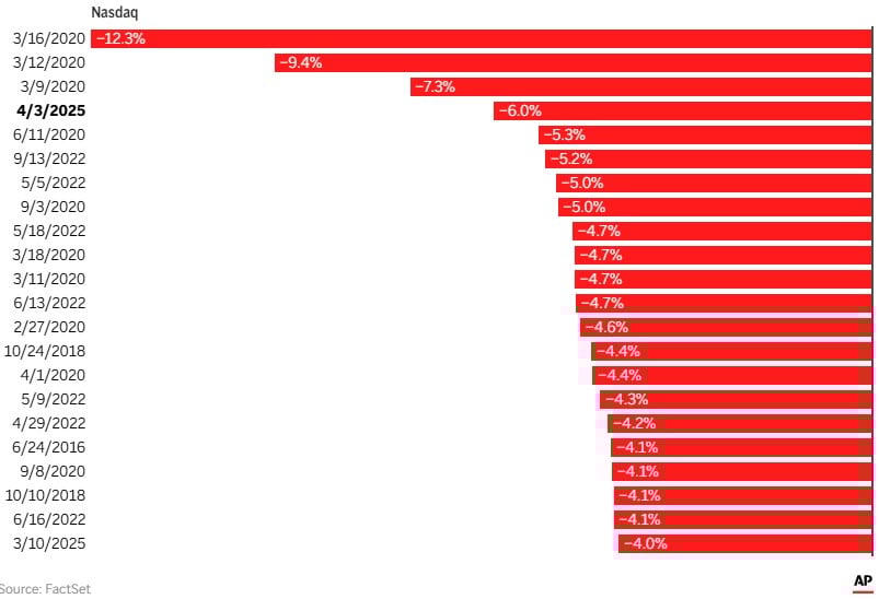 Các chỉ số chính ghi nhận mức giảm mạnh nhất trong 5 năm qua khi Tổng thống Donald Trump tuyên bố rằng "thị trường sẽ bùng nổ" để đáp trả mức thuế quan sâu rộng của ông.