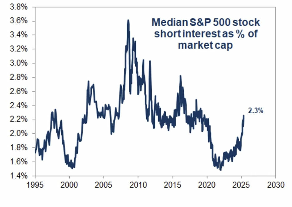 Đáng chú ý, tỷ lệ bán khống trung vị cổ phiếu trong S&P500 tính theo phần trăm vốn hóa tuần qua cũng đã tăng mạnh, đạt 2,3%, mức cao nhất kể từ 2016. Diễn biến này phản ánh rõ xu hướng phòng thủ của giới đầu tư trước các rủi ro chính sách và căng thẳng thuế quan, đồng thời phát đi tín hiệu cảnh báo về khả năng thị trường có thể tiếp tục điều chỉnh trong ngắn hạn.