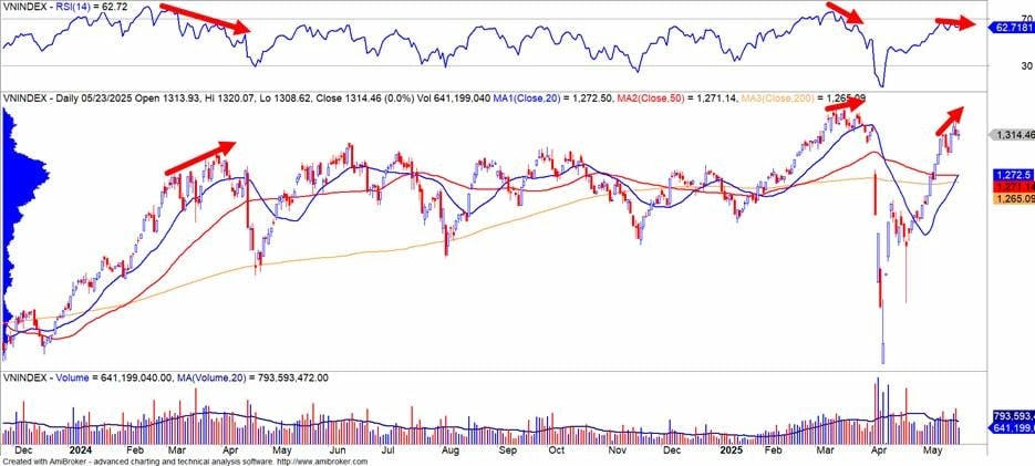 Theo báo cáo cập nhật ngày 26/5 của Yuanta Việt Nam, VN-Index nhiều khả năng sẽ điều chỉnh trong các phiên kế tiếp và thử thách vùng hỗ trợ 1.295 – 1.300 điểm. Tín hiệu chững lại của xu hướng tăng đang trở nên rõ ràng hơn, thể hiện qua trạng thái tích lũy ngắn hạn và sự thu hẹp của thanh khoản. Chỉ báo tâm lý thị trường cũng đang tiếp tục giảm, củng cố thêm quan điểm rằng rủi ro ngắn hạn vẫn hiện hữu và có xu hướng gia tăng.