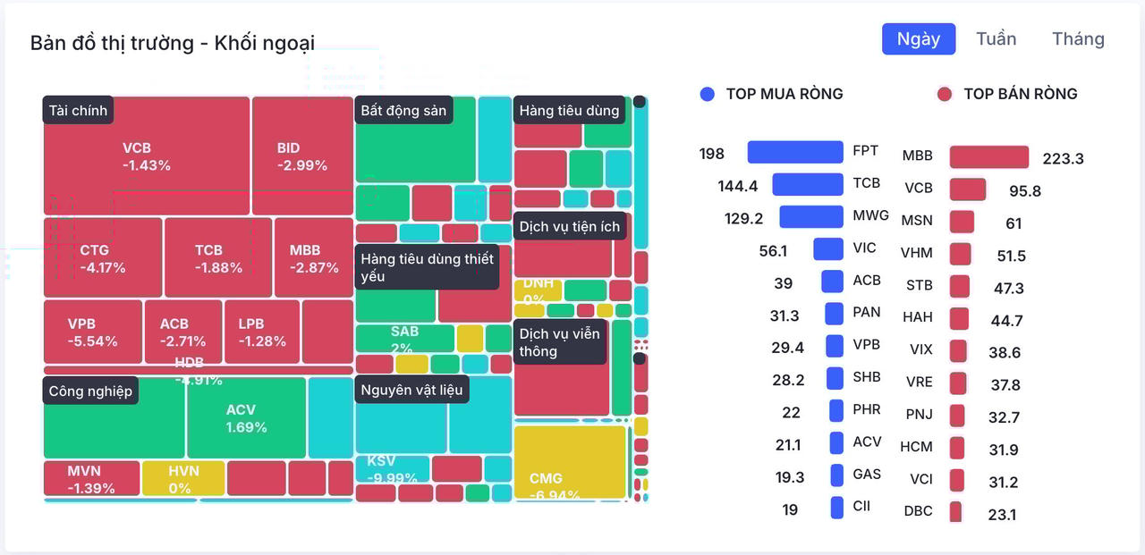 Ở chiều bán ròng, MBB và VCB dẫn đầu với giá trị lần lượt là 223,3 tỷ đồng và 95,8 tỷ đồng. Các mã khác trong danh sách bán ròng mạnh gồm MSN (-61 tỷ đồng), VHM (-51,5 tỷ đồng), STB (-47,3 tỷ đồng), HAH (-44,7 tỷ đồng), VIX (-38,6 tỷ đồng)...