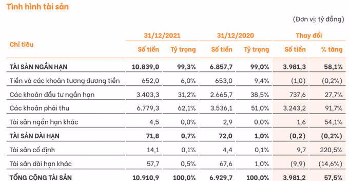 Báo cáo ghi nhận tổng tài sản công ty tại thời điểm cuối năm 2021 đạt hơn 10.900 tỷ đồng, tăng gần 4.000 tỷ đồng tương ứng tăng khoảng 57% so với đầu năm, trong đó có trên 99% là tài sản ngắn hạn. Nếu tính chi tiết, các khoản phải thu ngắn hạn bao gồm phải thu từ cho vay các dịch vụ tài chính, trả trước cho người bán… lên đến gần 6.780 tỷ đồng, chiếm hơn 62% tổng tài sản ngắn hạn của công ty.