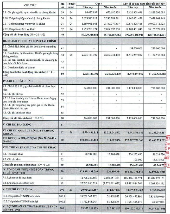 VDSC báo lãi sau thuế quý 4 gần 100 tỷ đồng, gấp nhiều lần số lãi hơn 200 triệu cùng kỳ năm trước. VDSC cho rằng sự tăng trưởng mạnh mẽ của thị trường chứng khoán trong quý IV cả về chỉ số và thanh khoản đã giúp các mảng hoạt động của công ty có nhiều thuận lợi.