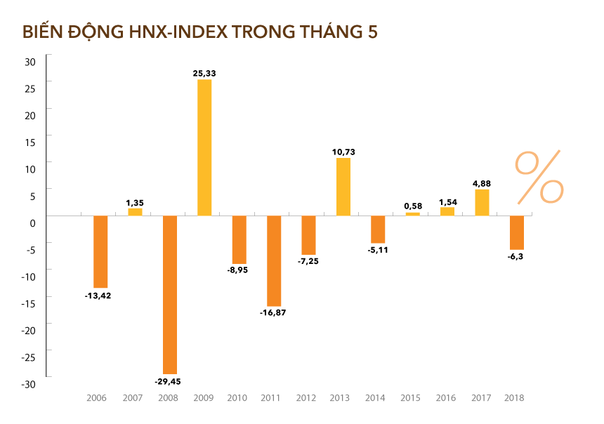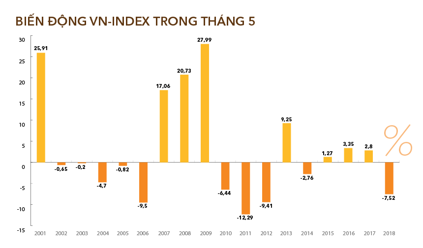 Tuy nhiên, thống kê lịch sử giao dịch thị trường chứng khoán Việt Nam cho thấy số lần tăng giảm trong tháng 5 khá cân bằng. Trong 18 năm vận hành của VN-Index kể từ năm 2001, chỉ số này có 10 năm giảm điểm và 8 năm tăng điểm. Tương tự, HNX-Index giảm 7 năm và tăng 6 năm (chỉ số này đi vào hoạt động từ năm 2006).
