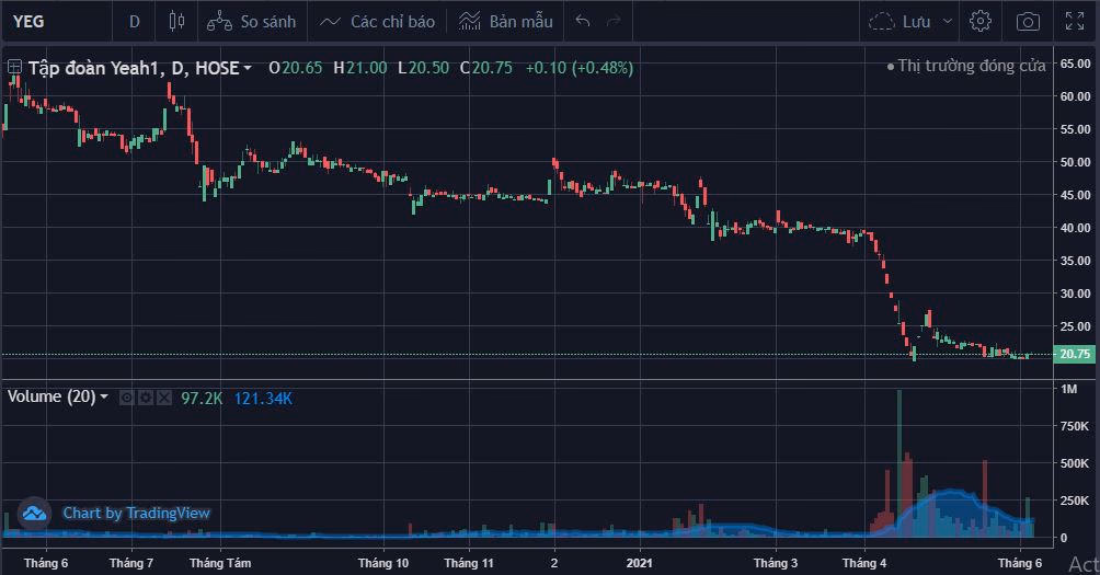 Cụ thể, cổ phiếu YEG của Tập đoàn Yeal 1 hiện lao dốc không phanh trong suốt 12 tháng qua, từ mức hơn 50.000 đồng/cp vào tháng 6/2020 xuống còn mức giá 20.650 đồng/cp tại phiên giao dịch ngày 3/6/2021.