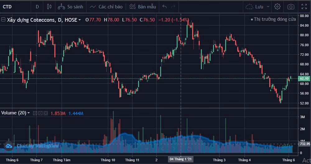 Trong khi đó, cùng thời điểm tháng 6,7/2020, cổ phiếu CTD liên tục tăng trần, giao dịch quanh mức 70.000 đồng/cp.