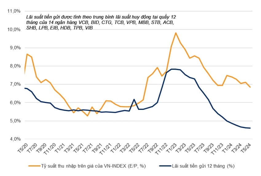 Một yếu tố khác tiếp tục hỗ trợ xu hướng tăng của thị trường chứng khoán trong dài hạn là việc tỷ suất sinh lời của VN-Index (tính bằng nghịch đảo của hệ số định giá E/P) ở mức khoảng 7%, cao hơn hẳn mức lãi tiết kiệm 12 tháng bình quân của các ngân hàng thương mại ở mức 4,6%, phần nào cho thấy sức hấp dẫn của thị trường chứng khoán cao hơn gửi tiết kiệm ngân hàng.