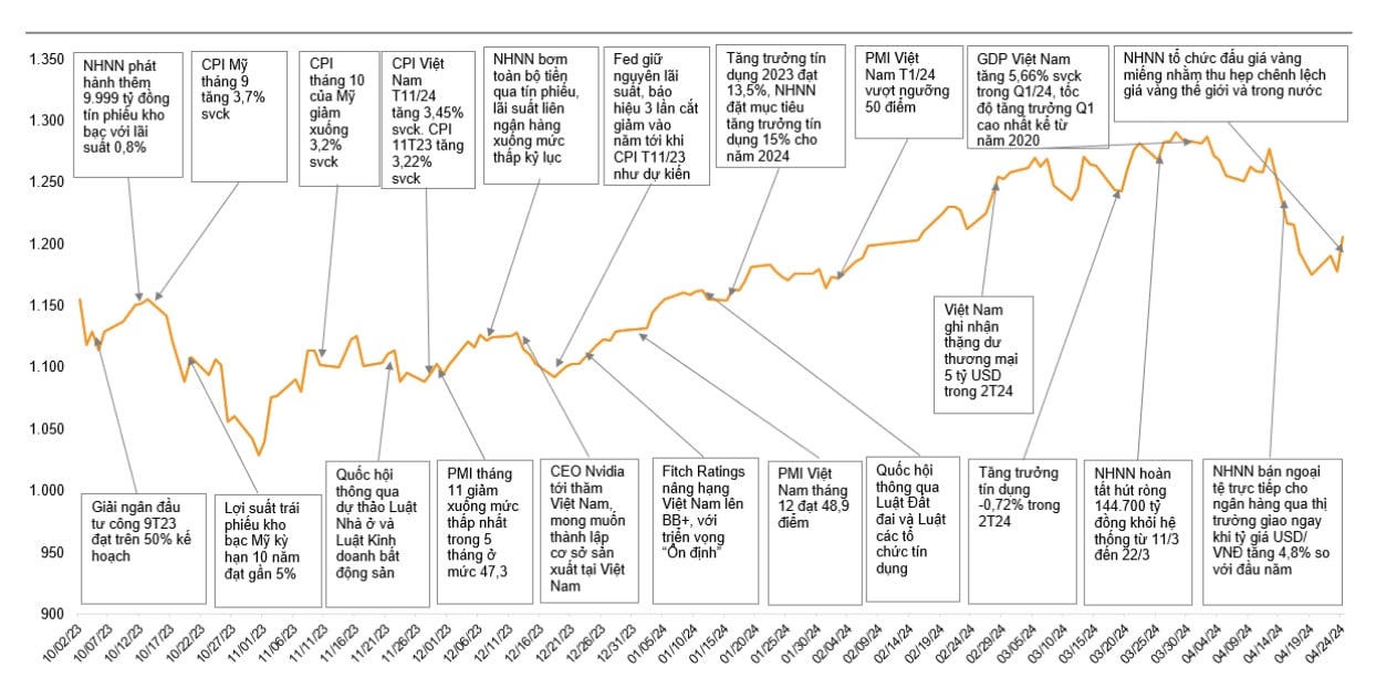 Sau quãng tăng gần như không nghỉ từ đầu năm, thị trường chứng khoán bắt đầu có dấu hiệu điều chỉnh từ cuối tháng 3/2024. Cao trào của quãng điều chỉnh vừa qua là vào ngày 15/4, chỉ số VN-Index giảm tới gần 60 điểm (tương đương 4,7%), rồi tiếp tục giảm gần 1 điểm vào phiên 16/4, giảm gần 23 điểm vào phiên 17/4 và giảm hơn 18 điểm vào phiên 19/4. Sau 4 phiên giảm liên tiếp như trên, VN-Index tạo đáy ở mức 1.174,85 điểm (thấp hơn khoảng gần 120 điểm so với mức đỉnh của năm) rồi đi lên.