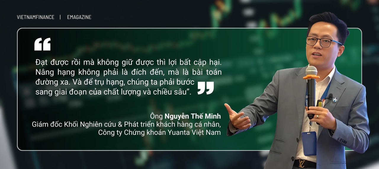 Vì vậy, theo ông Minh, đã đến lúc phải nhìn lại chất lượng của hàng hóa niêm yết, đặc biệt trong bối cảnh kỳ vọng nâng hạng đi kèm áp lực “trụ hạng”. Ông cảnh báo: “Đạt được rồi mà không giữ được thì lợi bất cập hại. Nâng hạng không phải là đích đến, mà là bài toán đường xa. Và để trụ hạng, chúng ta phải bước sang giai đoạn của chất lượng và chiều sâu”.