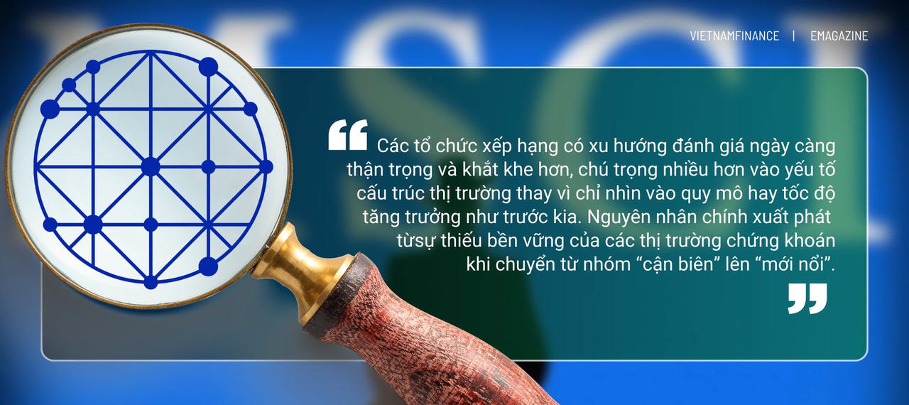 “Điều này buộc các tổ chức xếp hạng phải cẩn trọng hơn rất nhiều. Họ thể không chỉ dựa vào bộ tiêu chí kỹ thuật, mà còn phải khảo sát các quỹ đầu tư quốc tế – cũng chính là “khách hàng” sử dụng trực tiếp bộ chỉ số – để có đánh giá về mức độ phù hợp của thị trường. Nếu thị trường sau khi được nâng hạng gây ra rủi ro cho các quỹ, uy tín của MSCI cũng bị ảnh hưởng,” ông Minh phân tích.