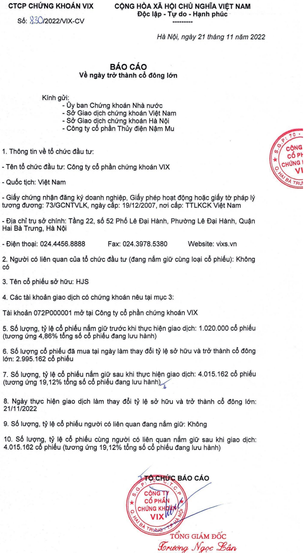 Ngày VIX trở thành cổ đông lớn tại Thủy điện Nậm Mu là 21/11/2022. Trong phiên này, cổ phiếu HJS xuất hiện giao dịch mua thỏa thuận bằng với số cổ phiếu mua vào của VIX, giá trị mua thỏa thuận ghi nhận gần 111 tỷ đồng - tương ứng giá mua 37.000 đồng/cổ phiếu. Đây cũng là giá đóng cửa của cổ phiếu HJS phiên 20/11.