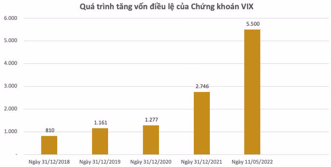Chứng khoán VIX cũng không đứng ngoài lề. Nếu như đến cuối năm 2018 vốn điều lệ công ty chỉ hơn gần 810 tỷ đồng, năm 2019 và 2020 tăng nhẹ lên lền lượt 1.161 và 1.277 tỷ đồng, thì năm 2021 và 2022 đều tiến hành tăng vốn khủng.