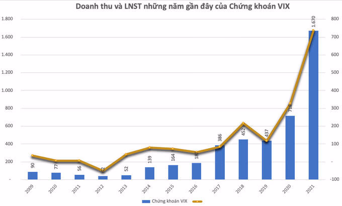 Báo cáo tài chính năm 2021 của Chứng khoán VIX ghi nhận cộng doanh thu hoạt động cả năm đạt gần 1.570 tỷ đòng, hơn gấp đôi so với con số 718 tỷ đồng đạt được năm 2020, trong đó lãi từ các tài sản tài chính thông qua lãi/lỗ đạt gần 1.100 tỷ đồng. Tổng lợi nhuận sau thuế cả năm tăng trưởng 124% so với năm trước đó, lên 735 tỷ đồng.