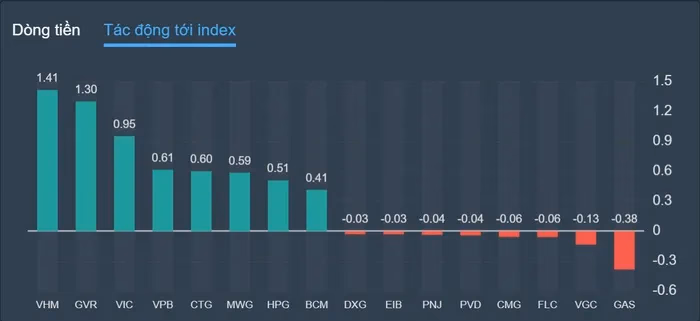 Đóng góp tích cực nhất cho sắc xanh của chỉ số đến từ nhóm Vingroup. Trong đó VHM của Vinhomes bứt phá 2,2% lên 61.000 đồng, VIC của Vingroup đi lên 1,5% đạt 65.900 đồng hay VRE có thêm 2,1% ở mức 29.200 đồng.