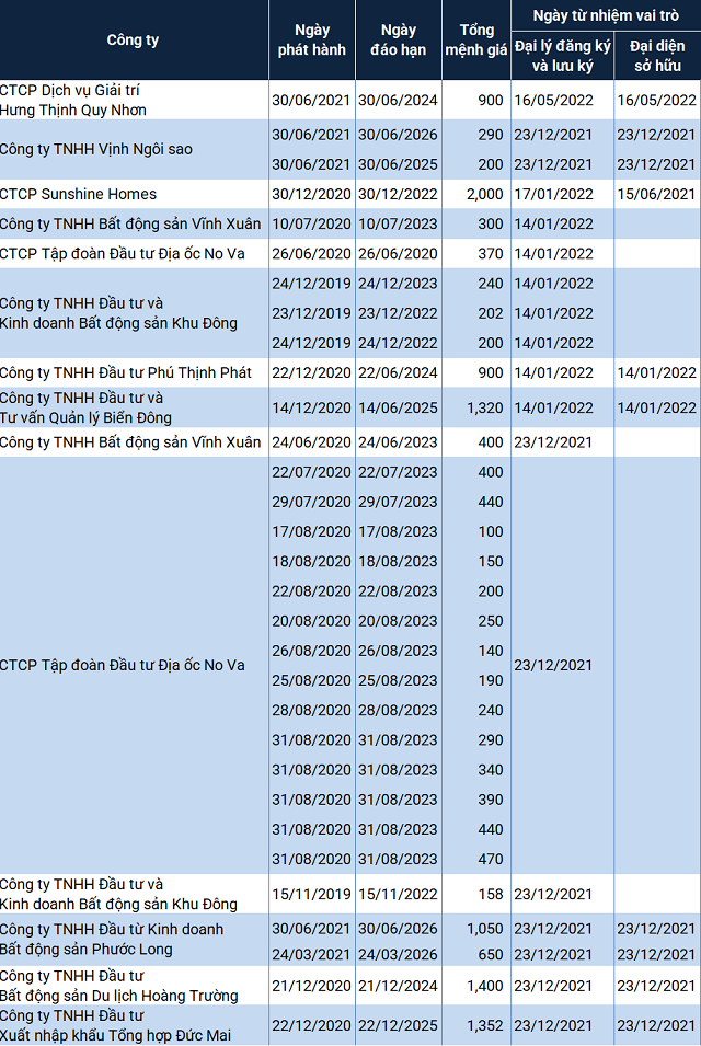 Cụ thể, 3 lô trái phiếu của Công ty TNHH Đầu tư và Kinh doanh Bất động sản Khu Đông trị giá hơn 600 tỷ đồng; lô trái phiếu của CTCP Sunshine Homes phát hành ngày 30/12/2020 có tổng mệnh giá trái phiếu tối đa là 2.000 tỷ đồng.
