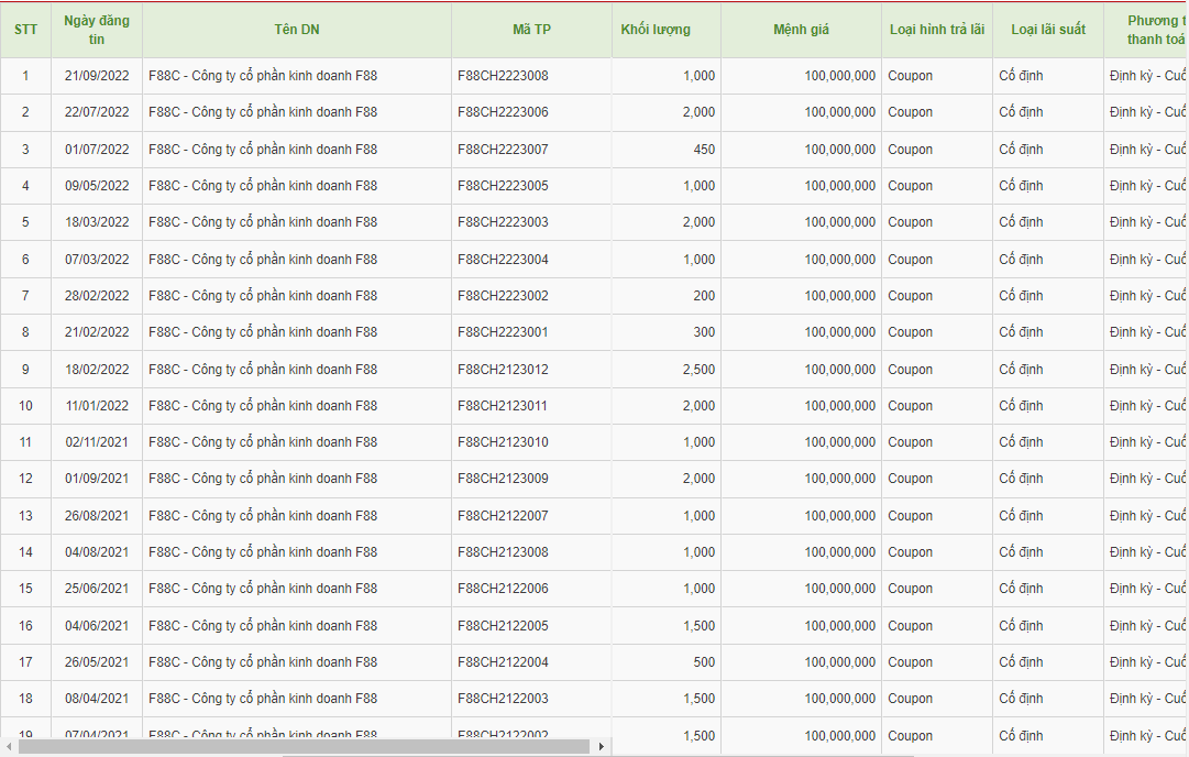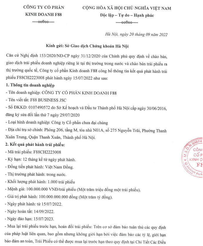 Sau hai tháng chào bán, mới đây, Công ty Cổ phần Kinh doanh F88 thông báo đã phát hành thành công lô trái phiếu mã F88CH2223008 có giá trị 100 tỷ đồng kỳ hạn 12 tháng. Lô trái phiếu này có khối lượng phát hành là 1.000 trái phiếu với mệnh giá 100.000.000VNĐ/trái phiếu. Ngày phát hành là 15/7/2022, đến ngày 14/9/2022 hoàn tất chào bán và ngày đáo hạn là 15/7/2023.