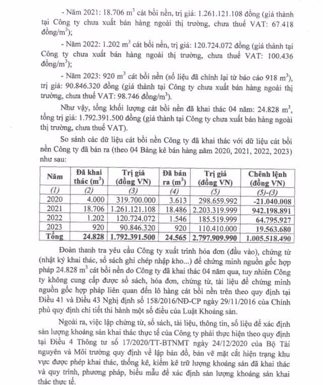 Ngoài ra, trong quá trình hoạt động khai thác, kinh doanh khoáng sản và qua quá trình thanh tra cho thấy, Công ty đã có hành vi vi phạm hành chính về mua, bán, vận chuyển, tàng trữ, tiêu thụ 24.828 m³ cát bồi nền không có nguồn gốc hợp pháp trị giá hơn 1,7 tỷ đồng (giả thành tại Công ty chưa xuất bản ngoài thị trường, chưa thuế VAT).