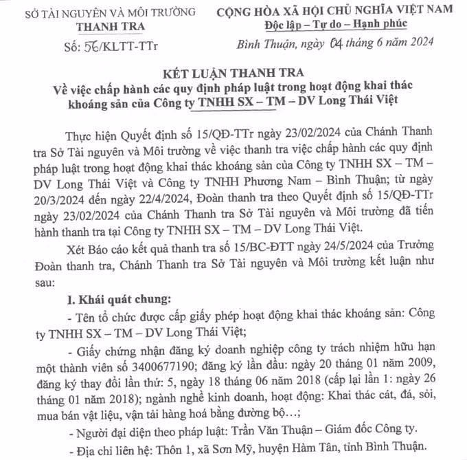 Chánh Thanh tra Sở TN&MT tỉnh Bình Thuận đã ban hành kết luận thanh tra số 56/KLTT-TTr ngày 4/6/2024, về việc chấp hành các quy định pháp luật trong hoạt động khai thác khoán sản của Công ty TNHH Sản xuất Thương mai Dịch vụ Long Thái Việt có trụ sở đặt ở xã Sơn Mỹ, huyện Hàm Tân, tỉnh Bình Thuận.