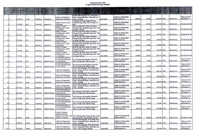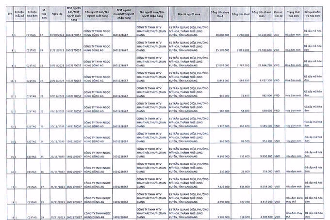 Đồng thời, Công ty TNHH Ngọc Hùng Dũng AG xuất hóa đơn GTGT bán ra có giá trị lớn, số lượng hóa đơn nhiều trong một thời gian ngắn; hóa đơn xuất bán cát san lấp cho nhiều đơn vị với giá trị lớn, sau đó Công ty lại xóa hóa đơn; xuất lại hóa đơn điều chỉnh, hóa đơn thay thế. điển hình như: