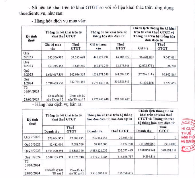 Theo đó, Chi cục Thuế Tp.Long Xuyên đã ban hành Thông báo số 5614/TB-CCT ngày 20/05/2024, về việc giải trình, bổ sung thông tin, tài liệu để làm rõ hồ sơ khai thuế GTGT, thuế TNDN năm 2023, 2024.
