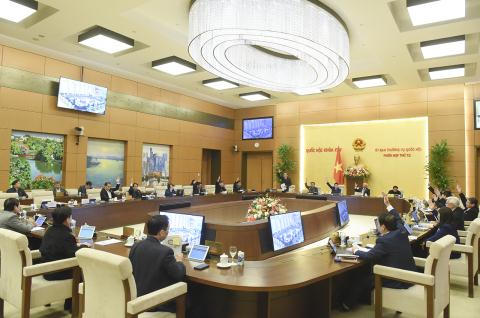 | Các Ủy viên Ủy ban Thường vụ Quốc hội biểu quyết thông qua Nghị quyết. Ảnh: Cổng TTĐT Quốc hội |