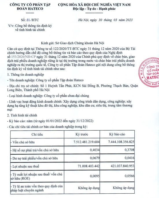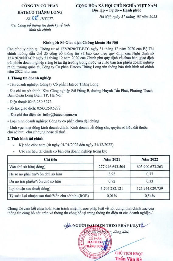 Cùng với đó, Công ty Cổ phần Hateco Thăng Long (Hateco Thăng Long) cũng đã công bố thông tin định kỳ về tình hình tài chính, qua đó ghi nhận lợi nhuận sau thuế năm 2022 xấp xỉ 326 tỷ đồng, tăng 8.050% so với năm 2021.