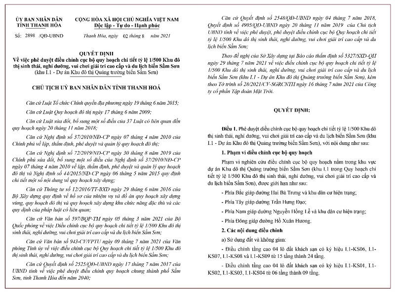 Được biết ngoài các nội dung điều chỉnh trên, UBND tỉnh Thanh Hóa còn điều chỉnh về hạ tầng kỹ thuật dự án. Các nội dung khác giữ nguyên theo đồ án Quy hoạch chi tiết tỷ lệ 1/500 Khu đô thị sinh thái, nghỉ dưỡng, vui chơi giải trí cao cấp và du lịch biển Sầm Sơn đã được Chủ tịch UBND tỉnh phê duyệt tại Quyết định số 2548 ngày 4/7/2018; phê duyệt điều chỉnh cục bộ tại Quyết định số 4905 ngày 20/11/2019.