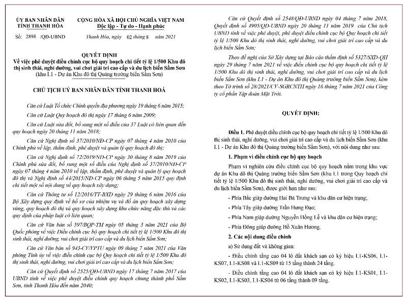 Mới đây, UBND tỉnh Thanh Hóa đã ban hành quyết định về việc về việc phê duyệt điều chỉnh cục bộ quy hoạch chi tiết tỷ lệ 1/500 Khu đô thị sinh thái, nghỉ dưỡng, vui chơi giải trí cao cấp và du lịch biển Sầm Sơn do CTCP Tập đoàn Mặt Trời (Sun Group) làm chủ đầu tư.