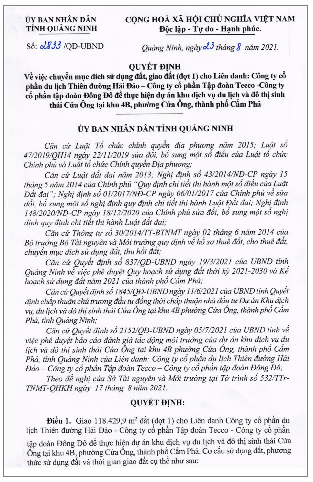 UBND tỉnh Quảng Ninh vừa ban hành văn bản về việc chuyển mục đích sử dụng đất, giao đất đợt 1 cho liên danh CTCP du lịch Thiên đường Hải đảo - CTCP Tập Đoàn Tecco - CTCP Tập đoàn Đông Đô để thực hiện Dự án khu dịch vụ du lịch và đô thị sinh thái Cửa Ông tại TP Cẩm Phả.