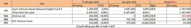 Asam Vietnam Equity Balanced Hegde Fund 3 mua vào gần 1,8 triệu cổ phiếu CTI. America LLC đã bán toàn bộ 269.800 cổ phiếu VLA. AFC Vietnam Fund mua thêm cổ phần SED và CPC.