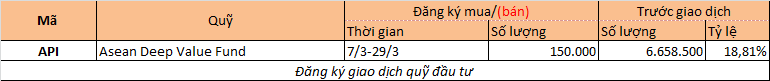 Ngay sau đó, quỹ ngoại lại tiếp tục đăng ký mua 150.000 cổ phiếu khác trong thời gian 7-29/3. Hiện Asean Deep Value Fund nắm giữ 6,66 triệu cổ phiếu, tỷ lệ 18,8% vốn API.